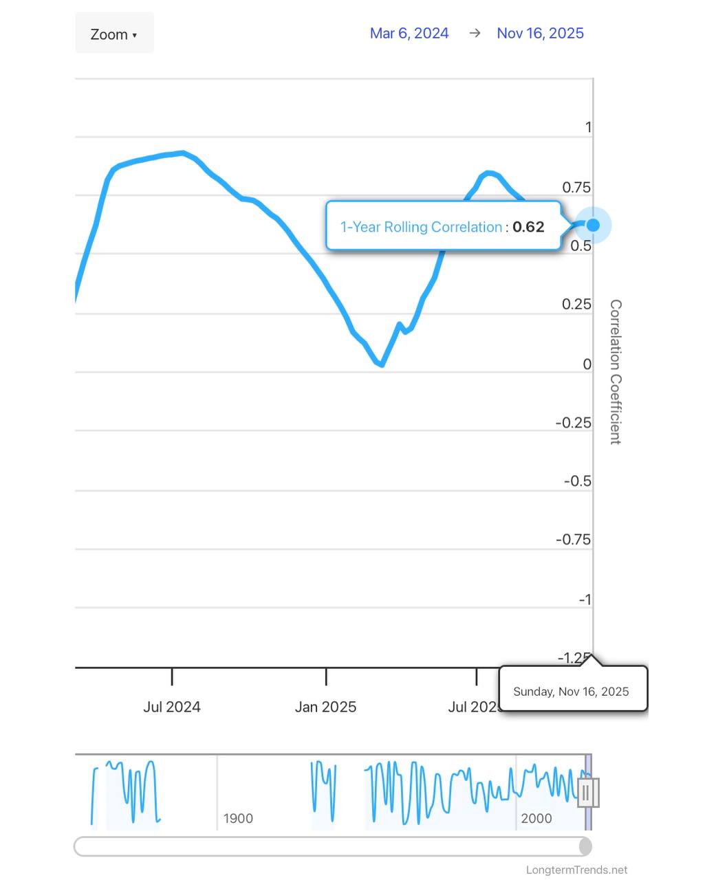 نمودار بالا ضریب همبستگی غلتان یکساله بین قیمت مس و قیمت طلا را در یک بازه زمانی یکساله نشان میدهد؛ چیزی که معمولاً همبستگی غلتان نامیده میشود. ضریب همبستگی +1 نشاندهنده همبستگی مثبت کامل است، یعنی دو فلز در بازه زمانی مشخص در یک جهت حرکت کردهاند. در مقابل، ضریب همبستگی -1 نشان میدهد که آنها در جهتهای مخالف حرکت کردهاند.